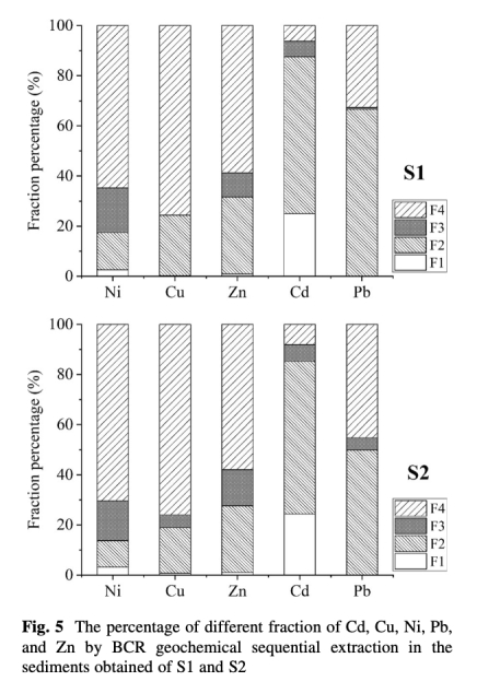 ? 數(shù)據(jù):Cd和Pb的F2(可還原態(tài))占比50-67%,Ni/Cu/Zn的F4(殘渣態(tài))占比58-76%。