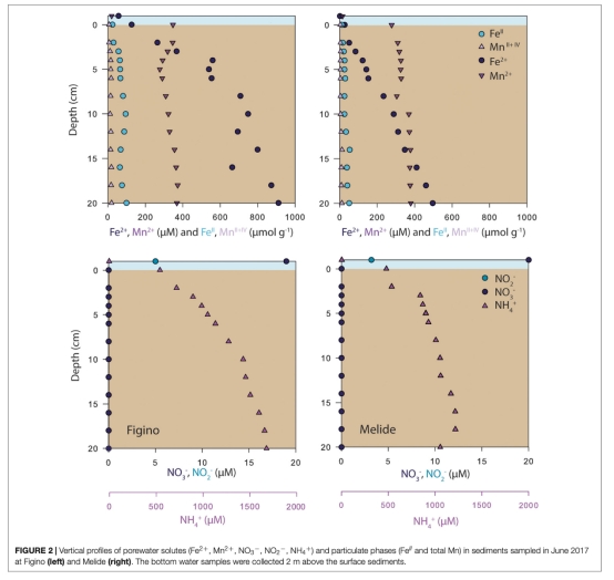 ? 數(shù)據(jù):Fe2?濃度(Figino站150-900 μM)、Mn2?(~350-400 μM)、NH??(~600 μM),NO??/NO??在界面處低于檢測限。