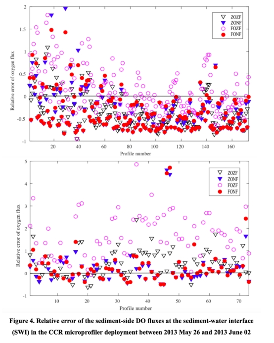 ? 微剖面數據揭示傳統零通量模型在沉積物深部的系統性偏差(圖2深部DO被高估),而負通量模型因還原物質氧化需求更貼合實測值。
