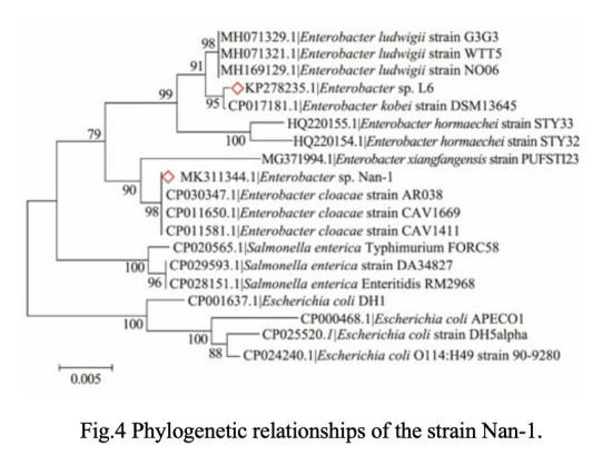 ? 通過16S rRNA基因序列(MK311344)和系統(tǒng)發(fā)育樹鑒定為Enterobacter sp. Nan-1(圖3-4)
