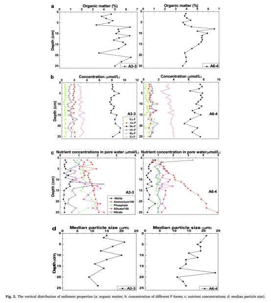 ? 數據:沉積物中值粒徑9-21 μm(圖2d);表層有機質含量4.0-4.4%(圖2a);生物有效磷以有機磷(Or-P)為主(51%)(圖2b)。