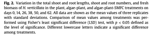 摘要指出沉積的藻類可為沉水植物提供養分,但其深層厭氧分解會抑制植物生長。沉積物微生物燃料電池(SMFC)可能促進藻源養分的利用并減輕其對黑藻(Hydrilla verticillata)的生物毒性。通過62天的微宇宙實驗(設置開路SMFC對照、植物、藻類、藻類+植物、藻類+SMFC、藻類+植物+SMFC六組),研究發現:1)黑藻的存在提升了SMFC產電性能(圖1a);2)產電過程通過改變藻類降解途徑(從乙酸裂解產甲烷轉向電化學還原)延緩藻分解(表1 CH?數據);3)在藻類緩慢分解期(14-38天),SMFC促進藻源無機碳和銨鹽向植物地上部分傳輸,提升黑藻生物量52.3%(圖2);4)在快速分解期(38-62天),SMFC減輕藻源銨鹽(NH??)對根系的毒性脅迫(圖6d-f),使沉積藻類成為穩定的植物營養源。