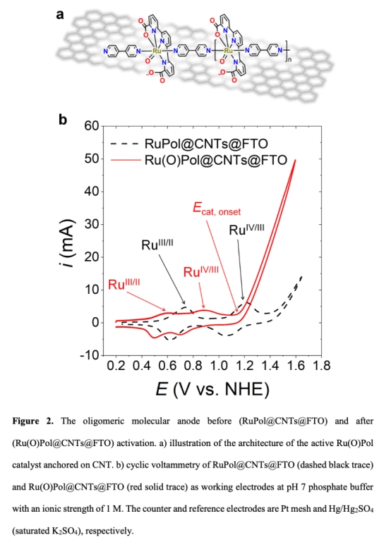 1. 分子陽極制備:合成寡聚釕催化劑RuPol,通過滴涂法負載于碳納米管修飾的FTO/玻碳基底