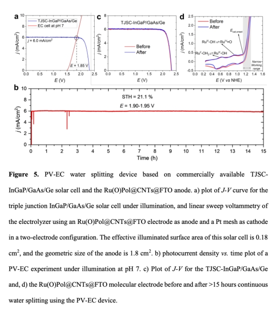 ? 數據:鈣鈦礦-PV-EC系統3 mA/cm2穩定電流(4小時);三結電池系統6 mA/cm2(15小時)