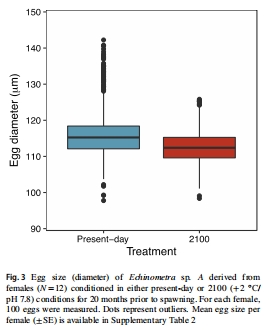 將成體海膽(Echinometrasp. A)置于模擬環(huán)境(當(dāng)代:26°C/pH 8.1 vs. 2100年:28°C/pH 7.8)20個月(覆蓋兩個繁殖周期)。