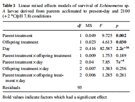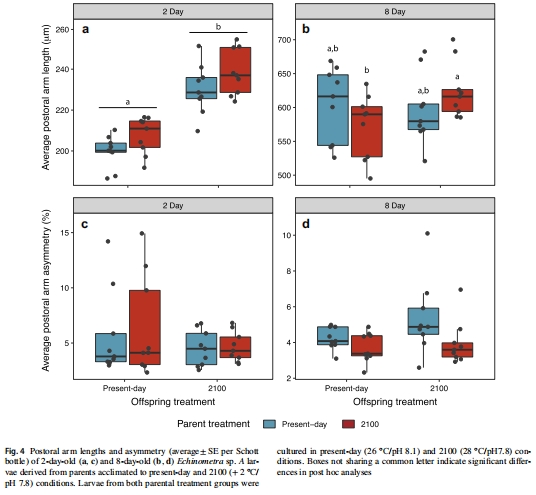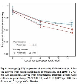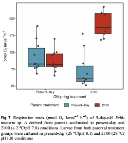 關(guān)鍵結(jié)論:父母長期(20個月)暴露于2100年預(yù)測海洋條件(升溫+2°C/酸化pH 7.8)雖加速后代幼蟲早期發(fā)育速率(體型更大、發(fā)育階段更早),但顯著降低存活率(15天時存活率僅43.7-50.6%),且呼吸代謝數(shù)據(jù)表明能量消耗模式異常。負(fù)面跨代效應(yīng)(減少生存)超過發(fā)育增益。