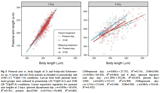 2100父母后代在2100條件下身體比例更大,表明發(fā)育加速(如8天斜率0.885 vs. 當(dāng)代組1.299)。