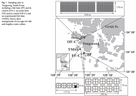 對比5個站點:商業化魚類養殖(FF)、牡蠣養殖(OF)、實驗性養殖(TMSS)及各自對照點(FF-C, OF-C)(圖1)。