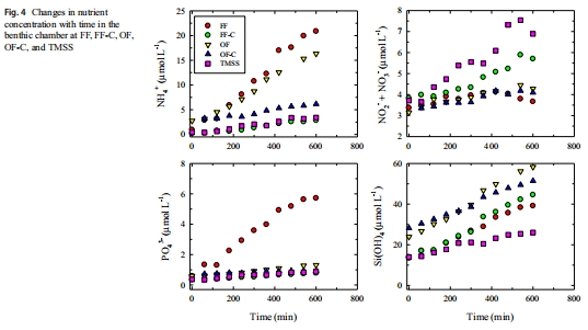 1. FF的SOD(-155.2 mmol·m?2·d?1)和BNF(NH??: 12.7 mmol·m?2·d?1;PO?3?: 3.3 mmol·m?2·d?1) 分別是對照點(FF-C)的3.6倍和10倍(表2, 表3)。
