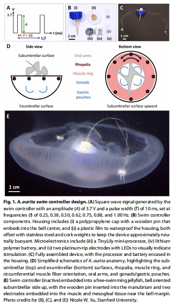 本研究開發了一種生物混合機器人,通過在活體水母(Aurelia aurita)體內植入微型電子控制器(圖1),實現對其游動的外部控制: