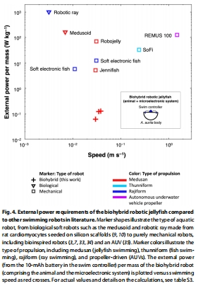 對比仿生機器人(如Robojelly)、AUV的能效(圖4),量化生物混合系統的優勢。