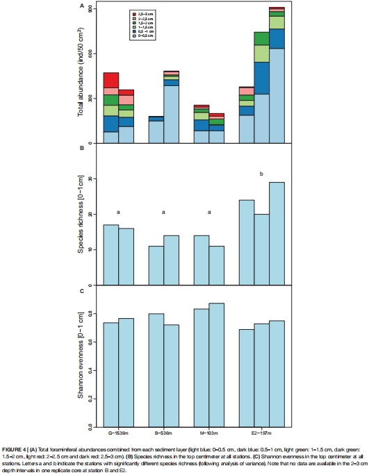 群落分析:切片沉積物(0-3 cm),CTG熒光染色鑒別活體有孔蟲,統(tǒng)計豐度與物種組成(圖4-5)。