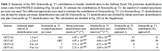 方法B:假設(shè)有孔蟲消耗細(xì)胞內(nèi)存儲(chǔ)硝酸鹽(最小貢獻(xiàn)估計(jì))(表2)。