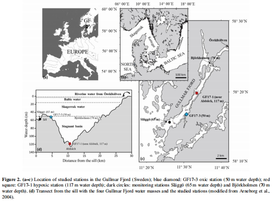 量化Nonionellasp. T1在挪威Gullmar峽灣兩種環(huán)境(富氧站GF17-3 vs. 缺氧站GF17-1)的豐度及分布(圖2c-d)。
