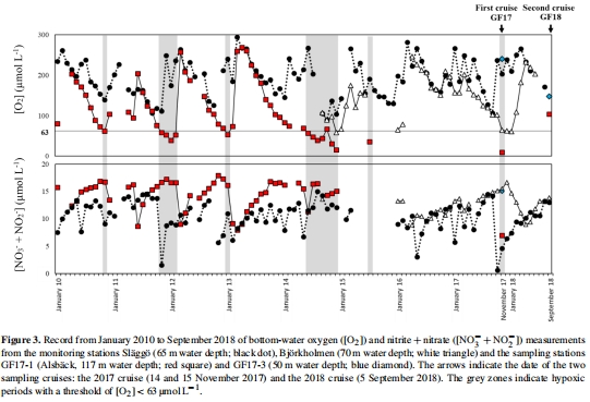 缺氧站(GF17-1):117m水深,底層水氧<9 μmol/L(圖3c),長(zhǎng)期季節(jié)性缺氧。