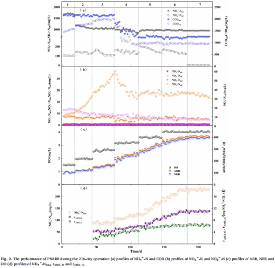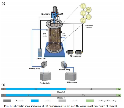 本研究開發了一種新型部分亞硝化-厭氧氨氧化生物膜反應器(PNABR),通過高溶解氧(DO=4.03±0.03 mg/L)結合預缺氧-好氧-缺氧運行模式(圖1),實現成熟垃圾滲濾液高效脫氮。關鍵突破包括: