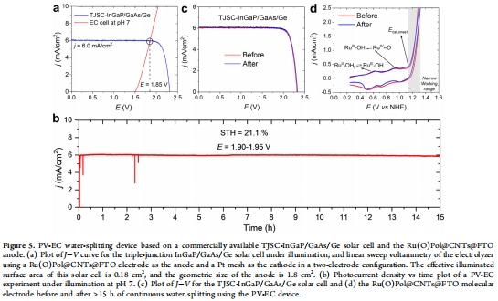 III-V族電池系統(tǒng):工作點1.85 V/6.0 mA/cm2(STH=21.2%,圖5a)。