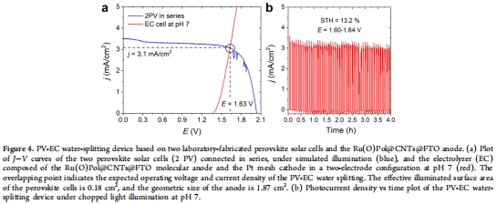 鈣鈦礦電池系統(tǒng):工作點1.63 V/3.1 mA/cm2(STH=13.2%,圖4a);