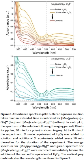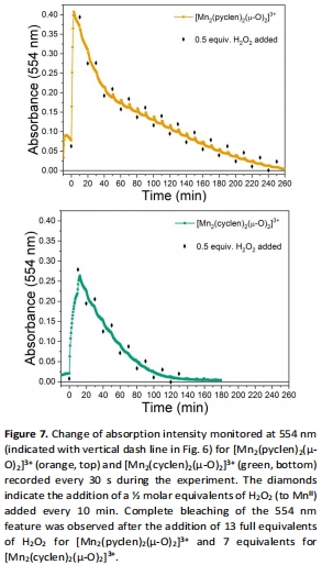 原位UV-Vis證實[Mn???-(μ-O)?-Mn??]3?二聚體在pyclen體系中可耐受13當量H?O?(cyclen僅7當量),對應圖7吸光度衰減曲線;