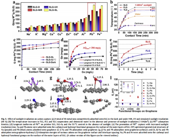 7天模擬光照后,單層石墨烯(SLG-S?)對Na?、Pb2?、Fe3?吸附量分別提升86.1%、77.3%和46.1%(圖5a);