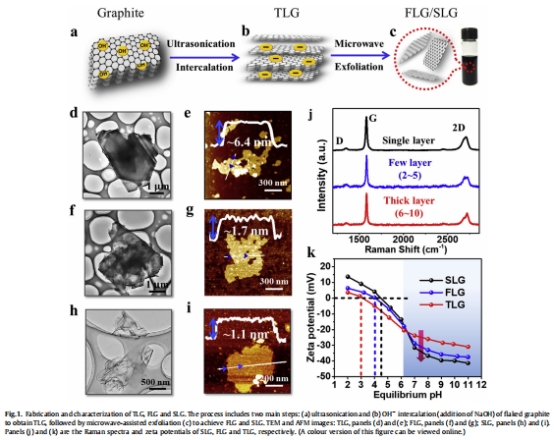 超聲-微波協(xié)同制備單層(SLG)、少層(FLG)、多層(TLG)石墨烯(圖1a-c);