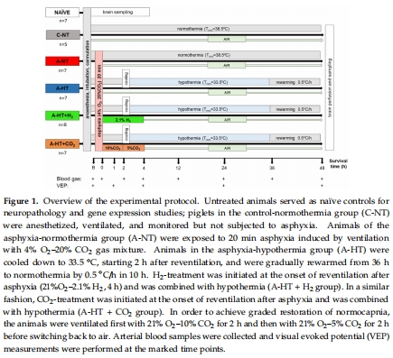 對(duì)照組(C-NT)、窒息+常溫(A-NT)、窒息+低溫(A-HT)、A-HT+H?、A-HT+CO?(圖1)。