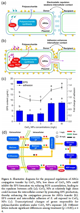 低濃度CeO? NPs(1–5 mg/L):抑制ARGs接合轉移(降低24–25%),機制包括清除ROS、減少胞外聚合物(EPS)合成、降低細胞粘附力、抑制能量代謝(圖2a, 圖4c)。