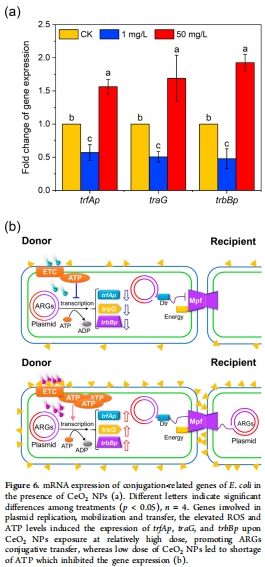 高濃度CeO? NPs(25–50 mg/L):促進ARGs轉移(增加42–53%),機制涉及誘導氧化應激、激活SOS響應、增加EPS合成、提升ATP供應(圖2a, 圖3a, 圖5b)。