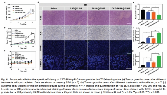 體內:靜脈注射后納米顆粒在腫瘤富集(圖4b),聯合放療顯著抑制腫瘤生長(圖6a-b)。