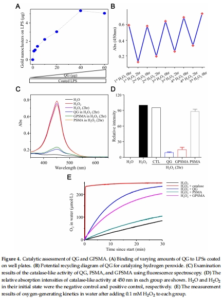 直接證實(shí)QG的 類過(guò)氧化氫酶活性,推翻“納米金催化活性受聚合物封裝抑制”的假設(shè)(圖4D-E)。