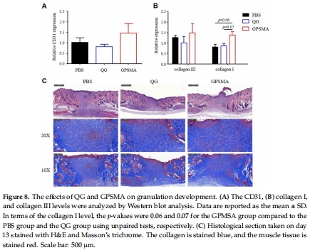 動(dòng)物實(shí)驗(yàn)驗(yàn)證:QG顯著加速傷口閉合(圖6),GPSMA促進(jìn)血管生成和膠原沉積(圖7-8)。