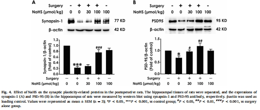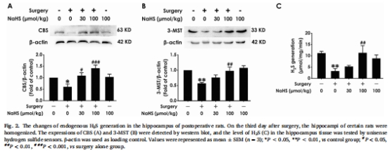 逆轉內源性H?S生成抑制:術后大鼠海馬內源性H?S合成酶(CBS、3-MST)表達下降,H?S水平降低(圖2),NaHS治療可恢復其水平。