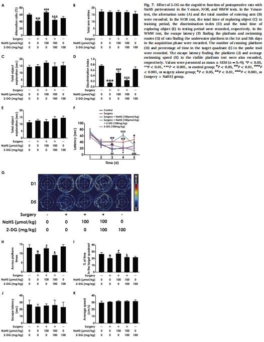 機制驗證:糖酵解抑制劑2-DG阻斷NaHS的沃伯格效應激活及認知保護作用(圖6-8),證實 H?S→沃伯格效應→突觸可塑性→認知改善 的通路(圖1)。