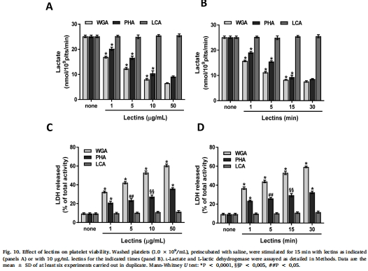 細胞毒性:凝集素降低血小板糖酵解活性并增加乳酸脫氫酶釋放,提示細胞損傷(圖10)。