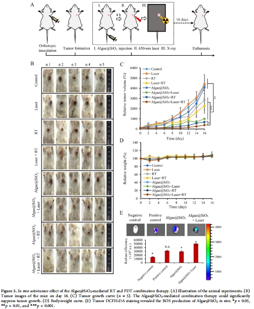 DCFH-DA染色:Algae@SiO?+激光組ROS陽性率99.2%(圖3B),體內腫瘤ROS顯著升高(圖5E)。