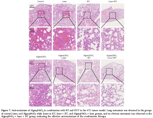 聯合治療組(Algae@SiO?+激光+RT)腫瘤體積抑制>90%(圖5C),HIF-1α表達降低(圖6G),肺轉移完全抑制(圖7)。