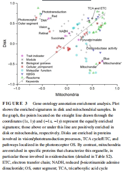 GO分析證實(shí)OS盤富集“視覺轉(zhuǎn)導(dǎo)”“TCA循環(huán)”“ETC”通路,線粒體富集“氧化還原”(圖3)。