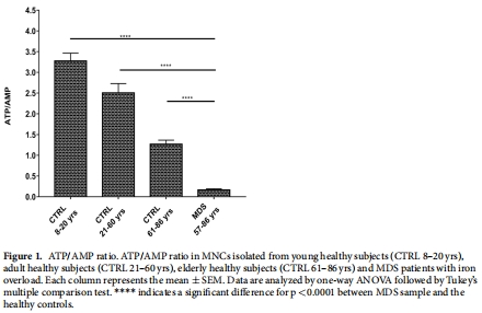 數(shù)據(jù):ATP/AMP比值在老年對照組(1.3±0.1)顯著低于年輕組(3.3±0.2),而MDS患者進一步降至0.2±0.03。