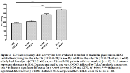 數(shù)據(jù):MDS的LDH活性(337±9.6 mU/mg)顯著高于年輕對照組(188.5±8.7),甚至高于老年組(281.7±13.4)。