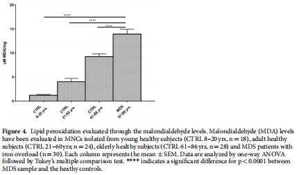 數(shù)據(jù):MDS的MDA水平(13.9±1 μM/mg)遠高于老年對照組(9.3±0.6),且與血清鐵蛋白正相關(guān)(r=0.8)。