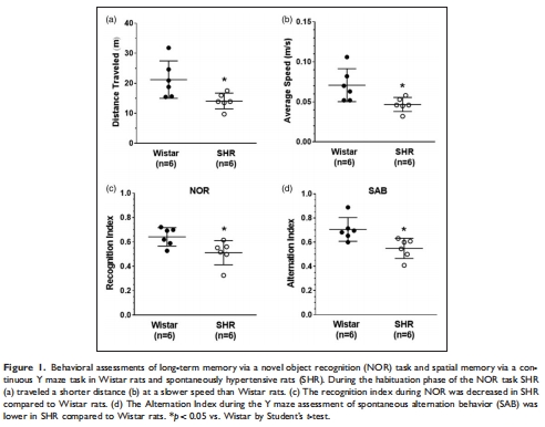 對比SHR與正常血壓Wistar大鼠的長期記憶(NOR任務)和空間記憶(Y迷宮)(圖1);
