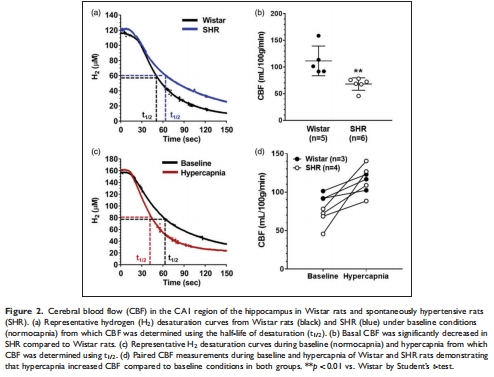核心發現:自發性高血壓大鼠(SHR)表現出長期記憶(LTM)和空間記憶障礙(圖1c,d),與海馬基礎血流量顯著降低(68±12 vs. 111±28 mL/100g/min, p<0.01)相關(圖2b)。