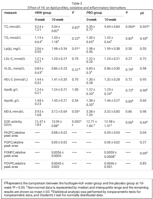 2.干預:HRW組飲用富氫水(245mL/次,3次/日,H?濃度650-700μmol/L),PBO組飲用純水,持續10周;