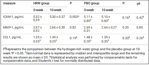 炎癥因子:ICAM-1降低(5.32→5.30 pg/mL, P=0.003);