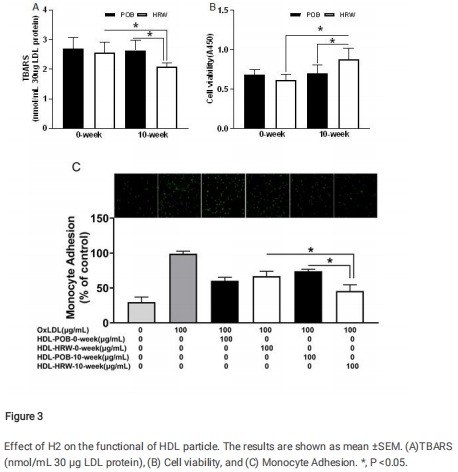 抗氧化:HRW組HDL抑制LDL氧化產物(TBARS)的能力增強(圖3A);