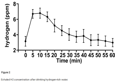 數據:飲HRW后5分鐘呼氣H?快速上升,10分鐘達峰值(≈7 ppm),60分鐘回基線。