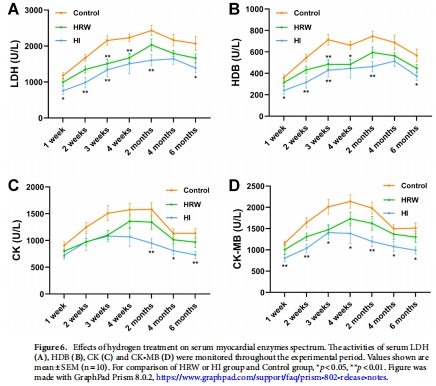 CK-MB活性:HI組第2月↓39%(p=0.0015),HRW組第3周↓27%(p=0.052)。