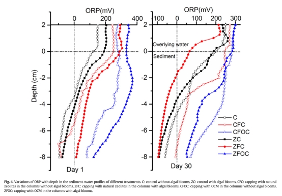 3 揭示缺氧驅動機制:明確藻華沉降導致SWI處ORP驟降(圖4),而OCM使表層ORP從-200 mV逆轉至+150 mV,闡明缺氧修復關鍵位點