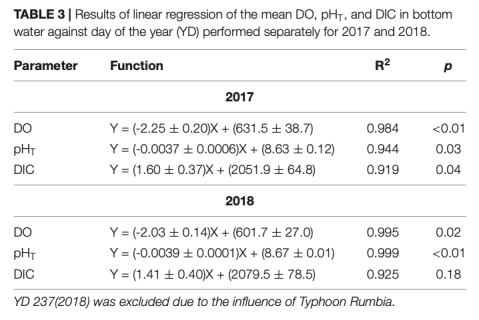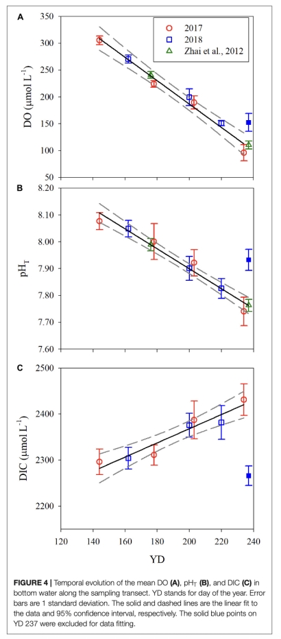 2. 氧耗與酸化趨勢:底層水體溶解氧(DO)和pH從5月至8月線性下降(DO降幅66%,pH降幅0.29),溶解無機碳(DIC)則上升(圖3-4,表3-4)。