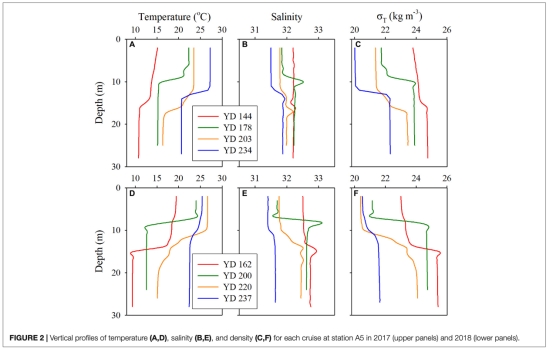 ? 結合溫度、鹽度、DO剖面(圖2-3),識別密度躍層位置(表2),證明分層穩定性是缺氧前提(臺風破壞分層后DO回升)。